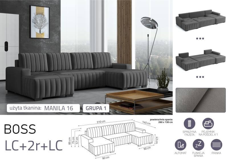 Model Boss U doskonale sprawdzi się w pokoju dziennym. Narożnik z opcją spania to doskonała propozycja, dla pomieszczeń, które łączą funkcję wypoczynku z funkcją sypialni. Pojemnik na pościel ukryje dodatkowe komplety kocy i poduszek. Wypełnienie siedziska sprężyną falistą zagwarantuje komfortowy odpoczynek. Automat ułatwiający rozkładania sprawi, że codzienne użytkowanie będzie lekkie i komfortowe.