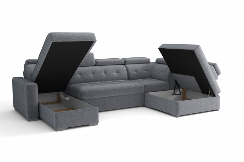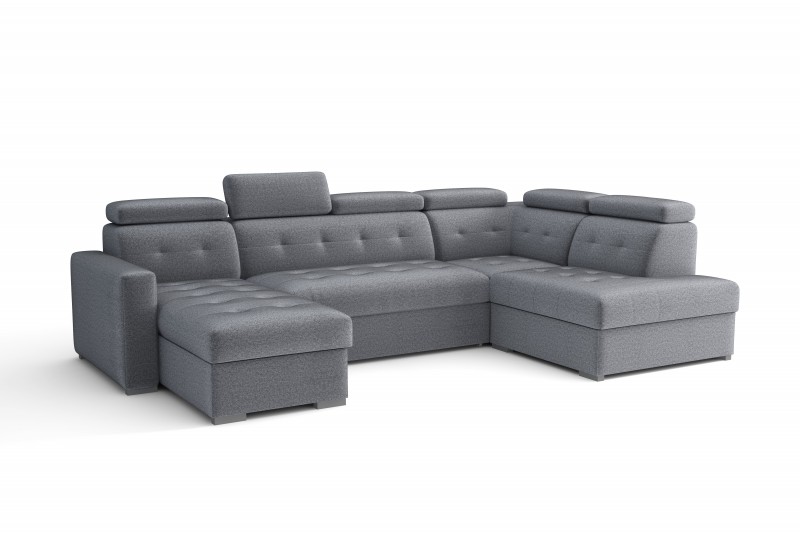 MARIO U to mebel, który łączy przestrzeń i elegancję z funkcjonalnością. Doskonale sprawdzi się w większych pomieszczeniach, oferując miejsce dla całej rodziny. Regulowane zagłówki, wysokiej jakości pianka HR i dwa pojemniki na pościel zapewniają wygodę oraz praktyczność, a jego nowoczesna forma doda wnętrzu stylu i harmonii.