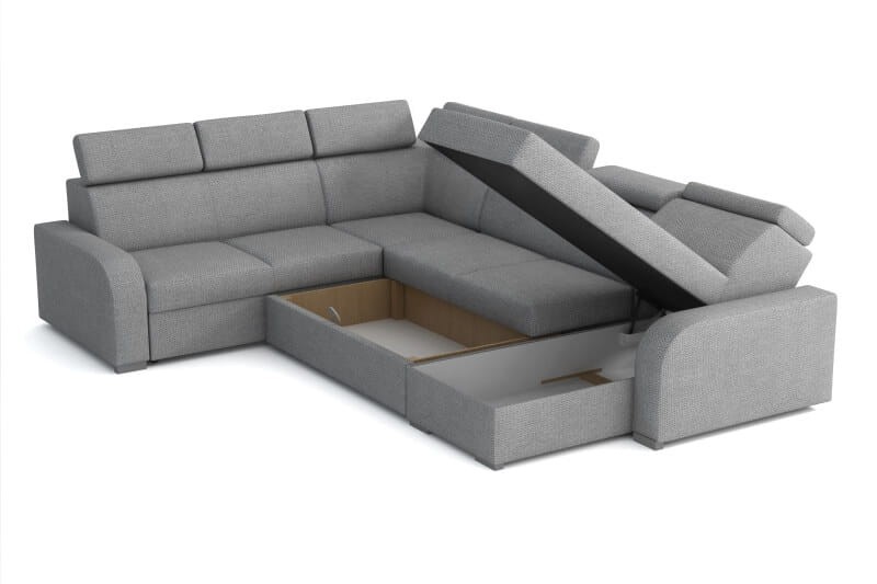 Rozkładany narożnik OLIVIA MAX został wyposażony w funkcję spania. Dzięki temu połączysz funkcję salonu oraz sypialni w jednym pokoju. Dwa pojemniki pod siedziskiem pomieszczą dodatkowe komplety pościeli, koców i poduszek. Sprężyna falista i pianka będące wypełnieniem siedziska zapewnią wygodę siedzenia i spania. Wszystkie regulowane zagłówki doskonale sprawdzą się, podczas czytania książek czy oglądania telewizji. Boczki stabilizujące spełnią rolę podłokietników oraz zagwarantują stabilną ekspozycję.