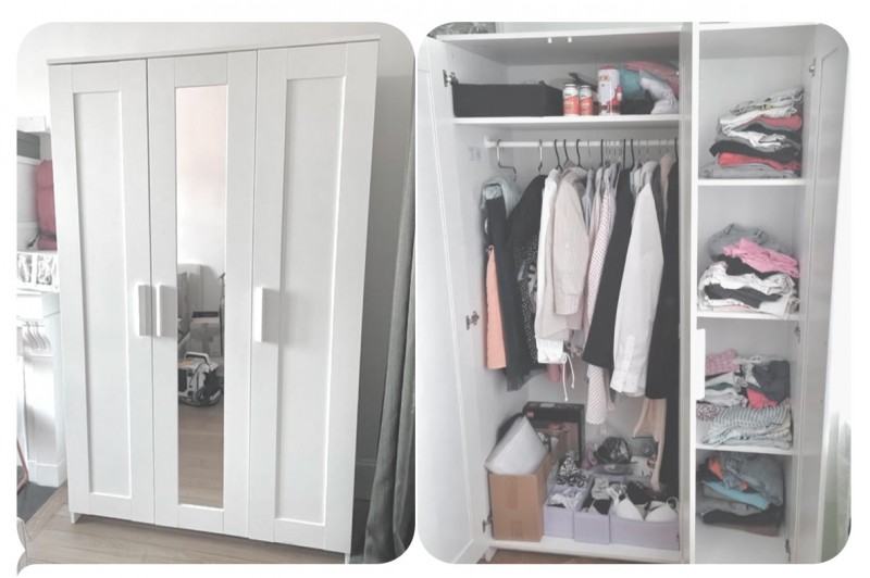 *3-drzwiową biała szafę z lustrem. W szafie są półki i drążek na wieszaki. Wymiary: 190x130x50