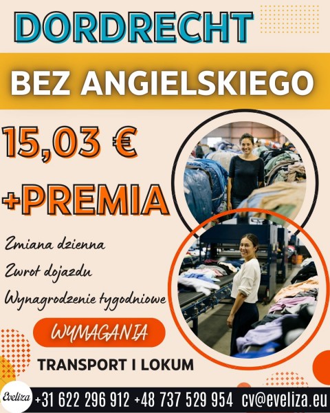 Miejsce pracy DORDRECHT 15,03 € + premia BEZ ANGIELSKIEGO