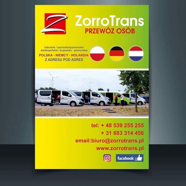 Firma ZorroTrans wykonuje licencjonowany przewóz Osób i paczek między Polską Niemcami i Holandią, jak i odwrotnie,obsługiwane województwa na terenie kraju to LUBUSKIE - ZACHODNIOPOMORSKIE , WIELKOPOLSKIE - KUJAWSKO POMORSKIE ,dysponujemy nowymi wygodnymi busami marki Renault Trafic,które są wyposażone w zestawy DVD, jezdzimy z adresu pod adres szybko i bezpiecznie CO PIATY PRZEJAZD 50% TANIEJ, zapraszamy serdecznie.