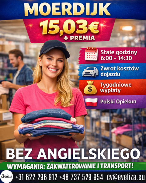 Miejsce pracy Moerdijk 15,03 € + premia BEZ ANGIELSKIEGO