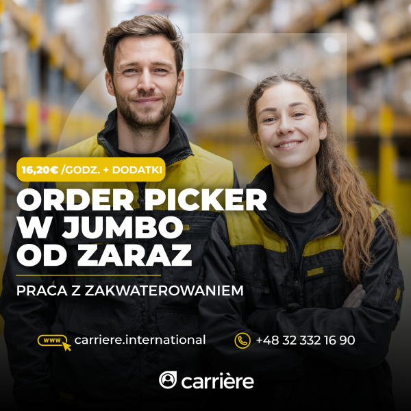 Jumbo to jedna z wiodących sieci supermarketów w Holandii. Firma obsługuje także zakupy online, po pandemii to jedna z najszybciej rozwijających się gałęzi firmy. Pracownicy działu e-commerce dbają o to, by zakupy dotarły na czas do domu klienta. Firma zatrudnia osoby z różnych krajów, w tym wielu Polaków, dbając o przyjazną atmosferę pracy i możliwość rozwoju.