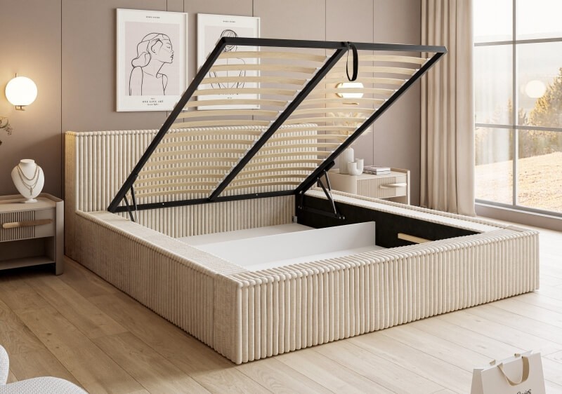 Nowoczesne łóżko sypialniane z pojemnikiem na pościel. Dostępne w 5 różnych rozmiarach. Stworzone z myślą o małych sypialniach oraz dużych apartamentach.
