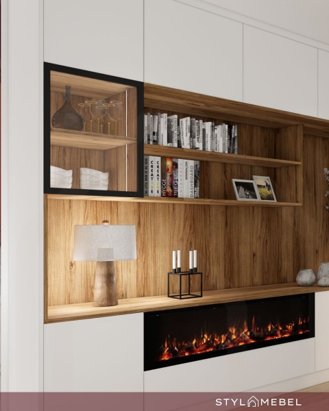 Zintegrowany kominek elektryczny wkomponowany w mebel