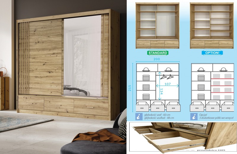 NOWOSC!!! SZAFA CANADA SZER.200CM.WYS.215CM I GLEB.60CM Z SZUFLADAMI OD DEMEUBELSHOP