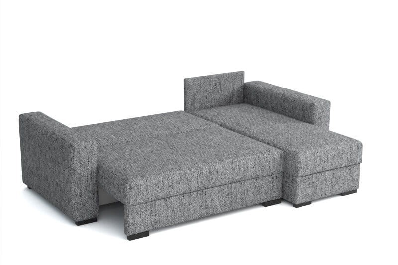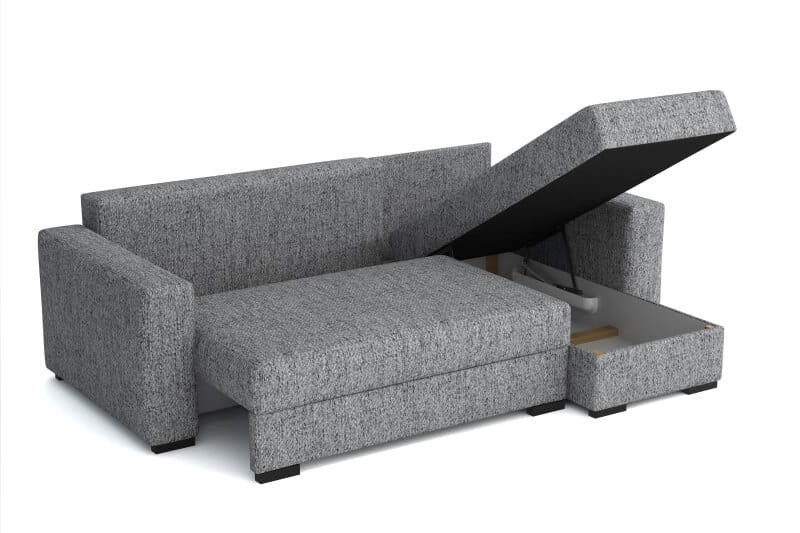 Mała sofa narożna z funkcją spania. Kanapa narożna do małego salonu lub pokoju młodzieżowego. Wyposażona w dwa duże pojemniki na pościel, które pomieszczą dodatkowe koce i poduszki. Dzięki temu w pomieszczeniu zapanuje ład i porządek. Funkcja spania zapewni miejsce do spania dla gości lub połączyć funkcję salonu i sypialni w jednym pomieszczeniu.
