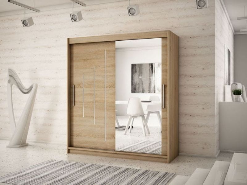 Bezsprzecznie duża szafa dwudrzwiowa pełni rolę funkcjonalną. To prawdziwa domowa garderoba. Jednak prezentowany model cechuje się również świetnym designem, zatem będzie stanowić istotny element aranżacji wnętrza. Przede wszystkim wykonana jest z wysokiej jakości materiałów, co widać na pierwszy rzut oka. Projektanci wykorzystali do konstrukcji 16 mm płytę laminowaną, zatem model PURMER wyróżnia się solidnością. Subtelny nowoczesny wygląd dopełniają detale. Są to uchwyty w srebrnym kolorze, oraz duże lustro na jednym z frontów.