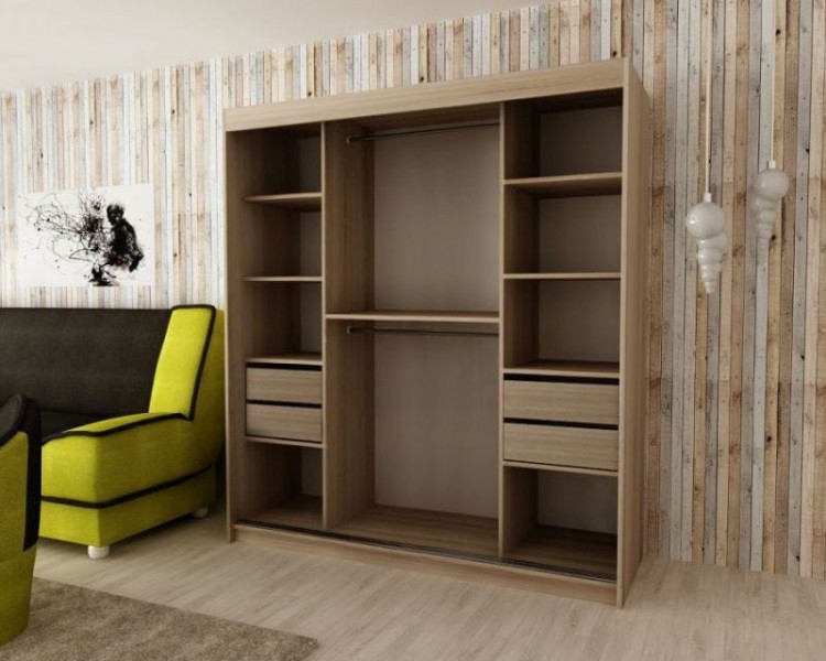 • w szafie dwoje drzwi, na środku do góry drążek pod nim półka pod półką drążek, z lewej