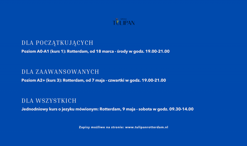 - Kurs 1, poziom A0-A1: Rotterdam, środy w godz. 19:00-21:00