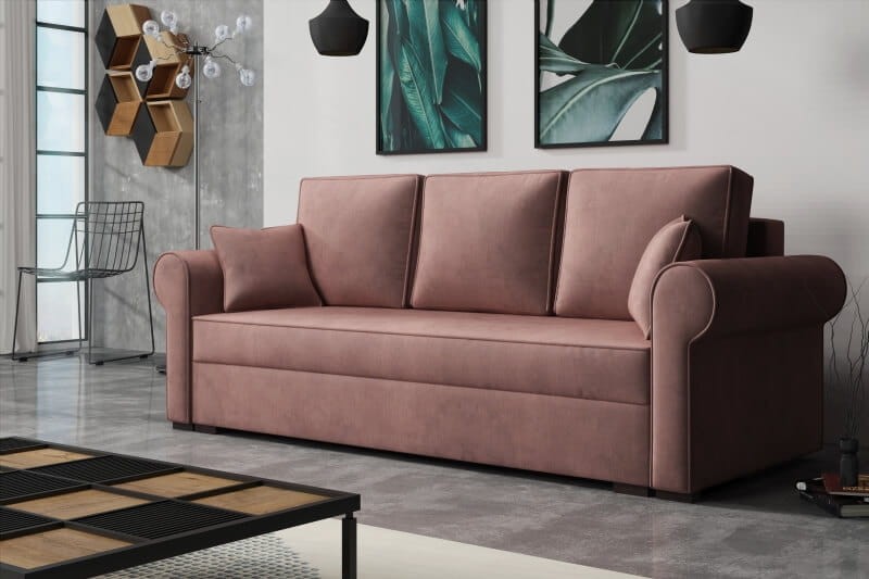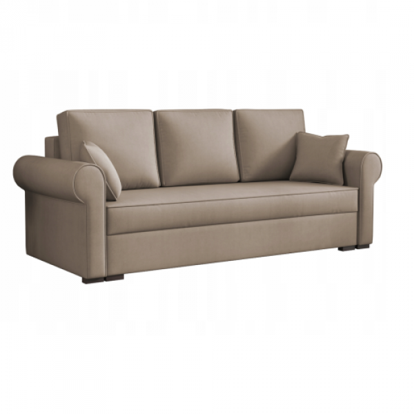 Wnętrze wypełnione połączeniem sprężyny BONELL i pianki. Dzięki takiemu połączeniu ciężar równomiernie rozłoży się na powierzchni kanapy bez nieestetycznych wybrzuszeń. Automat ułatwiający rozkładanie zapewni wygodne i szybkie użytkowanie każdego dnia. Pojemnik ulokowany pod siedziskiem pomieści dodatkowe komplety pościeli. Duże poduchy oparciowe będą wsparciem dla całej sylwetki. Dwa małe jaśki spełnią rolę dekoracyjną.