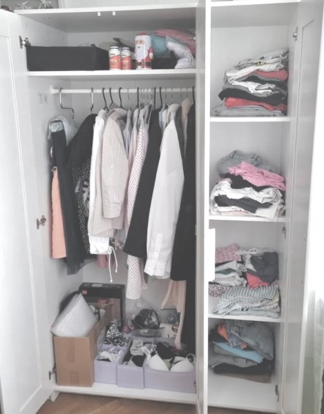 W każdej szafie są półki i drążek na wieszaki.