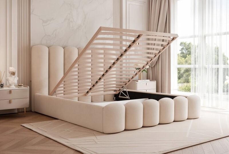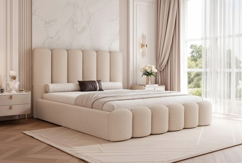 To piękne i nowoczesne tapicerowane łóżko sypialniane z pojemnikiem. Będzie zarówno wygodnym miejscem do spania, jak i ozdobą sypialni. Masywny i solidnie wykonany korpus zapewni stabilność. Duże i ciekawe wezgłowie dopełnia całości i przyciąga uwagę.