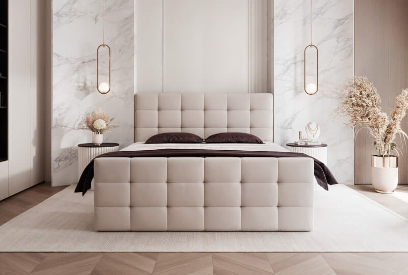Boxspring CALDO z 2 pojemnikami na pościel to stylowa i wygodna propozycja wśród łóżek sypialnianych. Zmieni wizerunek sypialni w nowoczesny apartament. Dostępne w 5 rozmiarach do małej, średniej i dużej sypialni.