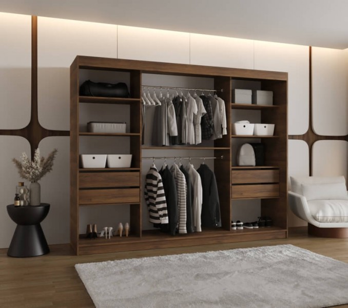 Mała przesuwna szafa z lustrem o szerokości 250cm w kolorze orzech warmia. Szafa ROBIN została wyposażona w pojemne półki oraz dwa poziomy drążków na ubrania wiszące.