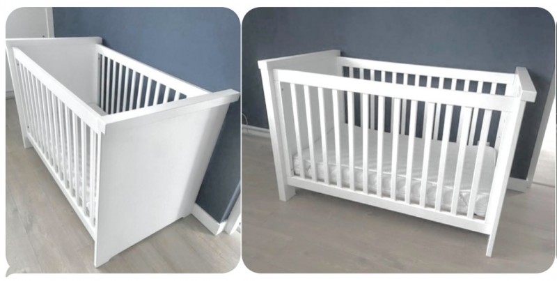 sprzedam - Solidne, białe łóżeczko z materacem. Regulowane poziomy wysokości.