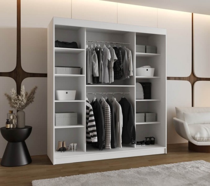Szafa LAMELO wyposażona została w półki i drążki, które ukryte są za przesuwnymi frontami. W sypialni pomieszczą dodatkową pościel, czy koce. W przedpokoju ukryje garderobe na każdy sezon, oraz nada pomieszczeniu charakteru.