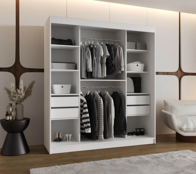 Nowoczesna szafa przesuwna z lustrem do salonu, przedpokoju lub sypialni. Szafa OTIS 180cm została wyposażona w pojemne półki oraz drążki na ubrania wiszące.