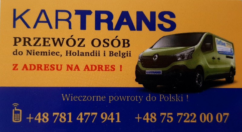 Firma Kartrans gwarantuje pełen profesjonalizm oraz wykwalifikowanych kierowców, którzy zadbają o bezpieczeństwo każdego Pasażera-co ważne Kierowcy są wypoczęci, do Polski wracają po całej dobie odpoczynku w hotelu!!
