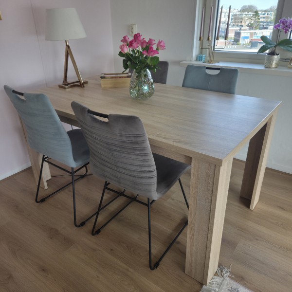 Stół prezentuje się bardzo dobrze – ma nowoczesny wygląd w kolorze jasnego drewna, dzięki czemu świetnie pasuje do różnych aranżacji wnętrz.