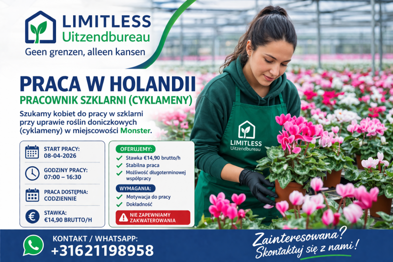 Szukamy kobiet do pracy w szklarni przy uprawie roślin doniczkowych (cyklameny) w miejscowości Monster.