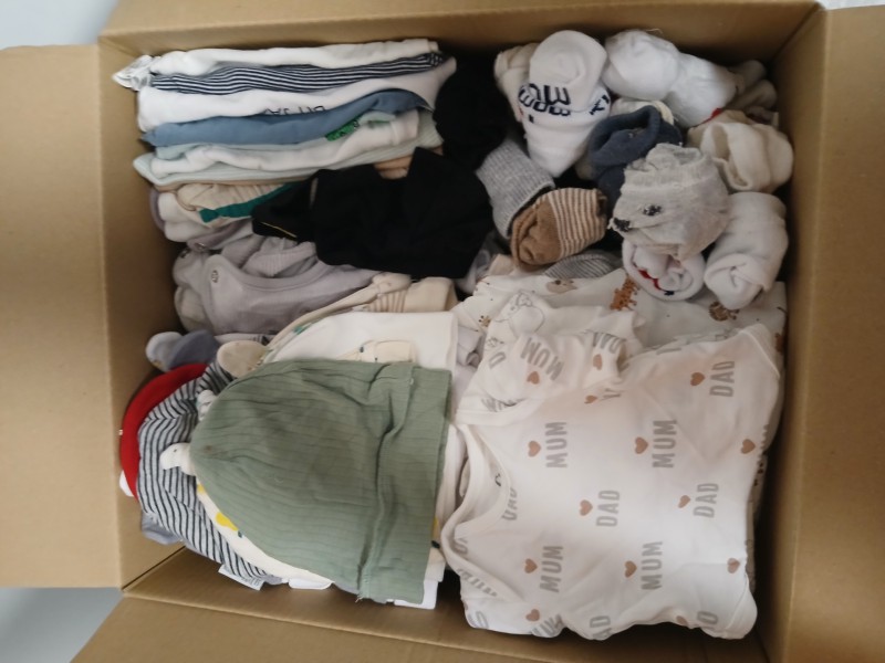 Zamiwnie 3 kartony ubranek dla chlopczyka rozmiar od 50 cn do 74 na pampersy 6 z pampersa baby dry paw patrol