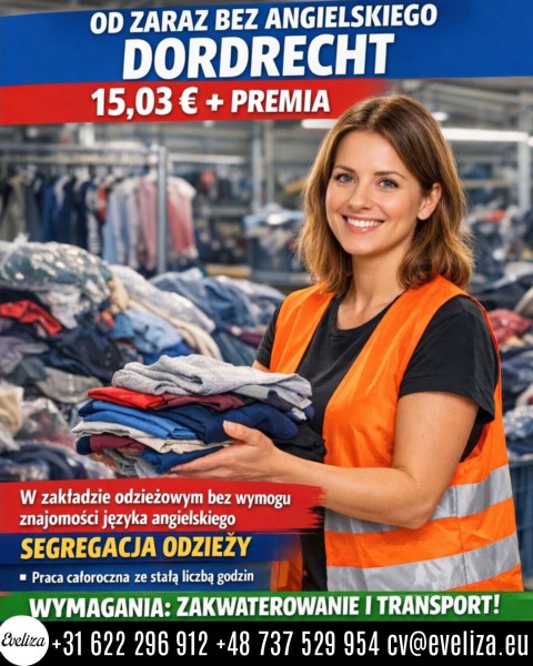 Miejsce pracy DORDRECHT 15,03 € + premia BEZ ANGIELSKIEGO