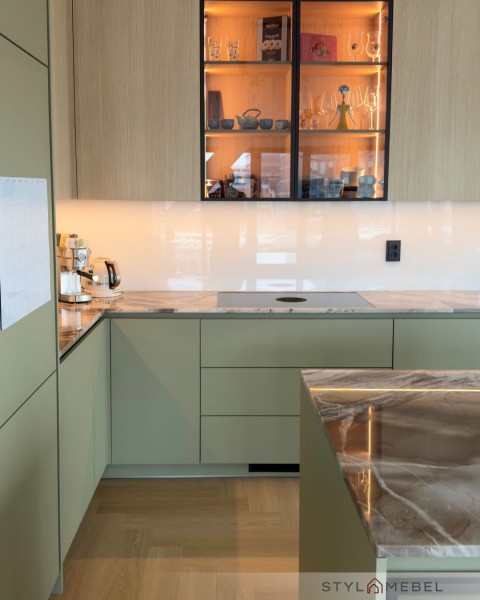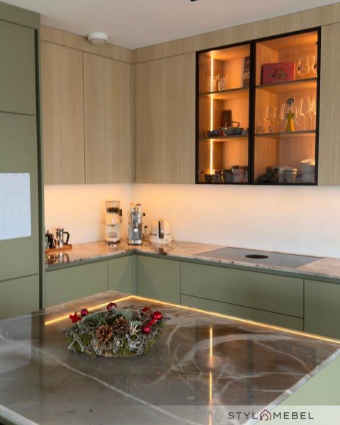 Harmonia barw: Głęboka, matowa zieleń dolnych szafek w połączeniu z jasnym rysunkiem drewna powyżej tworzy przytulny, a zarazem luksusowy klimat.
