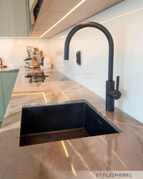 Kuchnia, w której szałwiowy kolor spotyka się z ciepłem drewna. To idealny przykład na to, jak nowoczesna zabudowa może stać się sercem domu. Co sprawia, że ten projekt jest wyjątkowy?