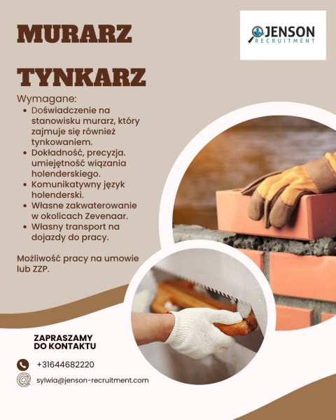 Dla jednego z Naszych klientów Jenson -Recruitment poszukuje doświadczonego murarza tynkarza.