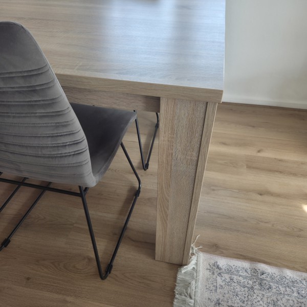 Stół prezentuje się bardzo dobrze – ma nowoczesny wygląd w kolorze jasnego drewna, dzięki czemu świetnie pasuje do różnych aranżacji.