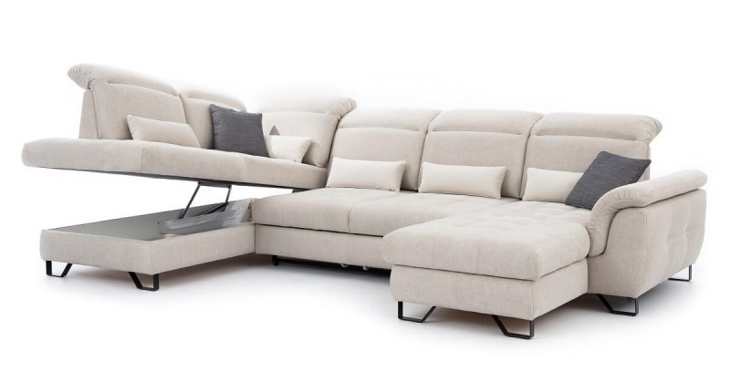 W tym sezonie w salonie rządzą jasne kolory. Beż, krem, szarość to najmodniejsze barwy sof. Giovani maxi wyróżnia się optyczną lekkością. Świetnie sprawdzi się w dużym salonie, polubi też wielobarwne dodatki. Giovani maxi urzeka harmonią. Nie razi i nie przytłacza pomieszczenia, natomiast sprawia, że staje się przytulne, czyste i zachęca do odpoczynku. Idealnie odnajdzie się w mniejszych kawalerkach, gdzie salon wieczorową porą staje się sypialnią. Jednym ruchem z narożnika stworzysz pełnowymiarowe łóżko sypialniane. Pościel zaś wyjmiesz z pojemnika, który mieści się w dole kanapy. Funkcjonalny element narożnika będzie zawsze pod ręką.
