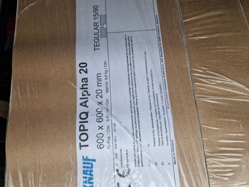 Do sprzedania Knauf Topiq Alpha 20 600x600x20 Tegular 15/90.Posiadam 12 paczek po 3.6m2, łącznie 43.2m2.