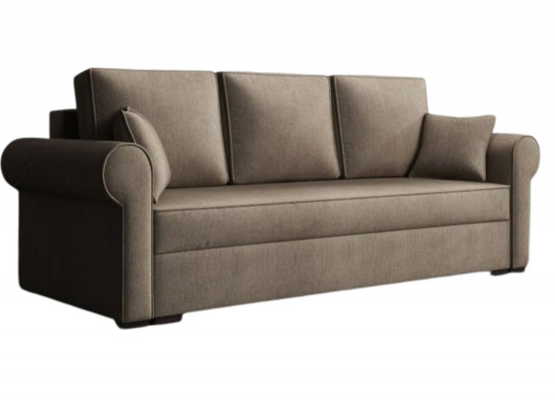 Wnętrze wypełnione połączeniem sprężyny BONELL i pianki. Dzięki takiemu połączeniu ciężar równomiernie rozłoży się na powierzchni kanapy bez nieestetycznych wybrzuszeń. Automat ułatwiający rozkładanie zapewni wygodne i szybkie użytkowanie każdego dnia. Pojemnik ulokowany pod siedziskiem pomieści dodatkowe komplety pościeli. Duże poduchy oparciowe będą wsparciem dla całej sylwetki. Dwa małe jaśki spełnią rolę dekoracyjną.