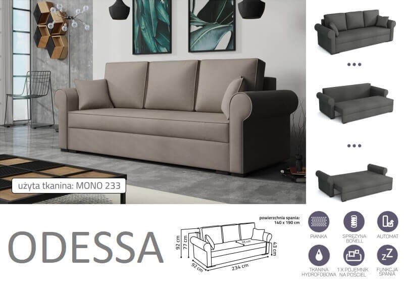 Nowoczesna sofa z funkcją spania i pojemnikiem na pościel. Wykończona mięciutką w dotyku tkaniną plamoodporną i wodoodporną. Doskonale sprawdzi się zarówno w salonie, jak i pokoju młodzieżowym. To wygodny i ponadczasowy mebel, który w nocy zamieni się w wygodne łóżko. Solidna, stabilna i modna urzeka od pierwszego wejrzenia.