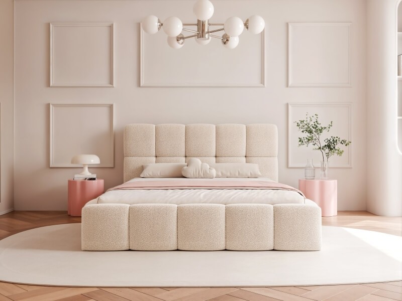 Ten model łóżka do sypialni dostępny jest w wyjątkowych tkaninach standardowych oraz plamoodpornych i zmywalnych w różnych kolorach i wzorach.