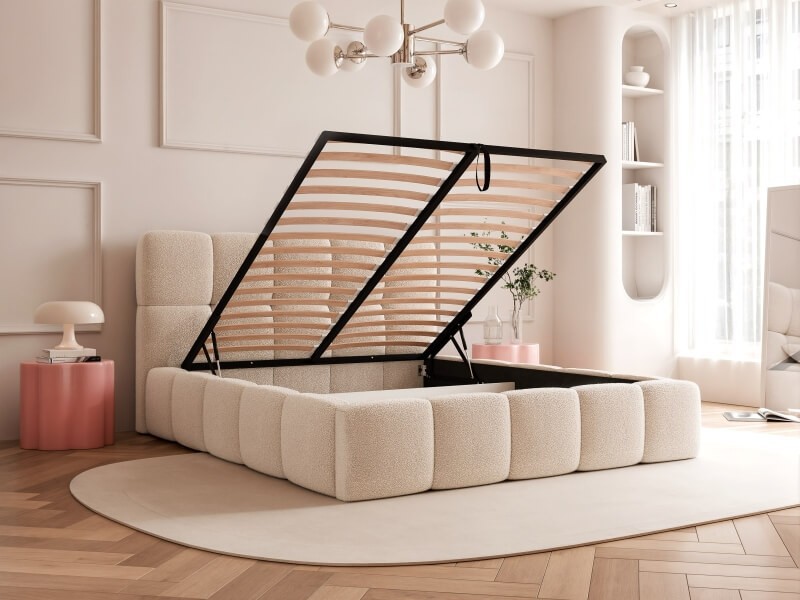 Łóżko zostało wyposażone w duży pojemnik na pościel. Pomieści koce i poduszki oraz dodatkowe komplety pościeli. Łatwy dostęp do zawartości pojemnika zapewnia stelaż metalowy z siłownikiem.