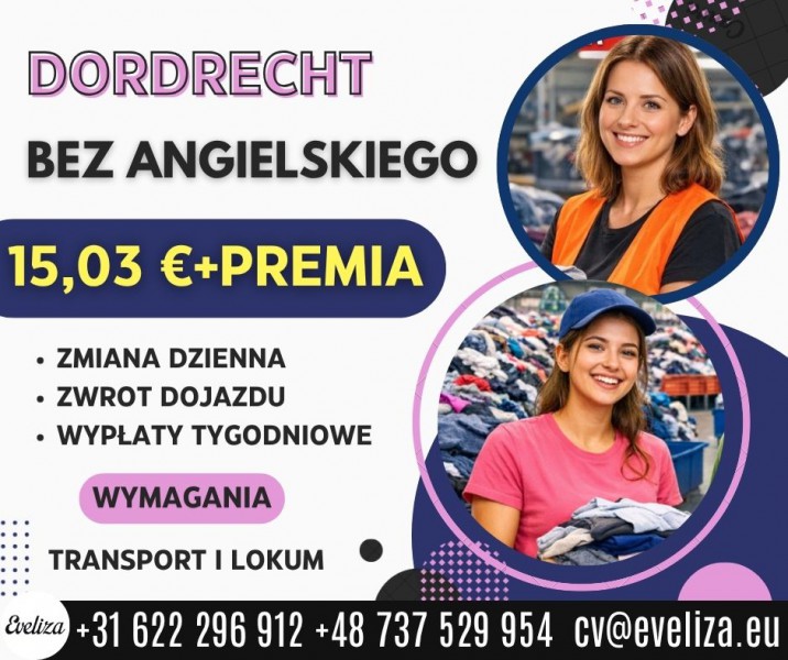 Miejsce pracy DORDRECHT 15,03 € + premia BEZ ANGIELSKIEGO