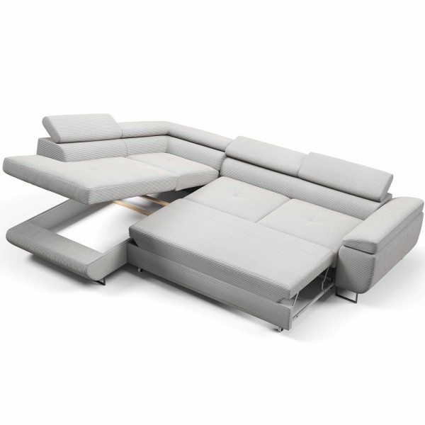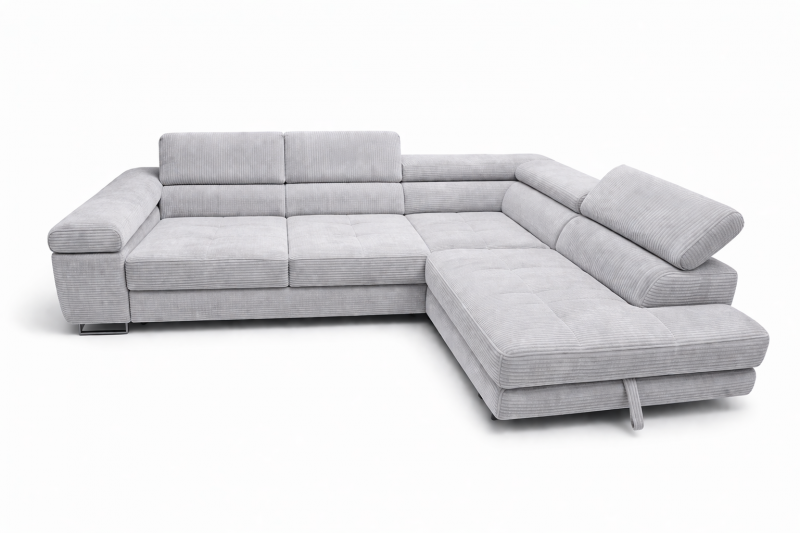 Narożnik został wyposażony w funkcję spania z wysuwanym materacem, który z łatwością zamienia sofę w wygodne łóżko dla gości. To praktyczne rozwiązanie sprawdzi się zarówno na co dzień, jak i podczas okazjonalnych noclegów.