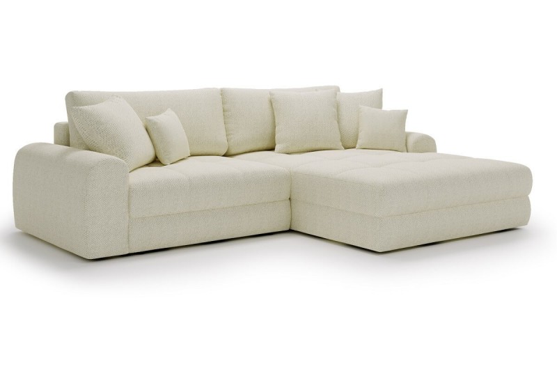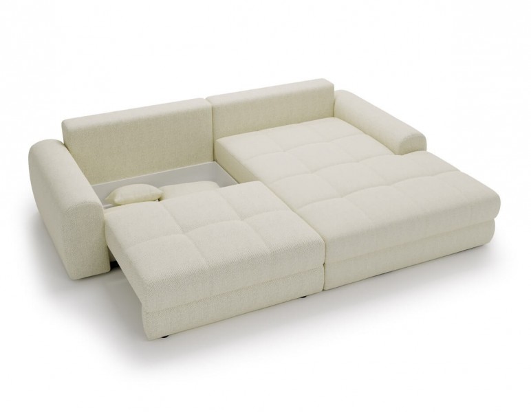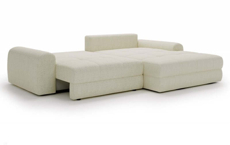 Solidna, stabilna i masywna sofa narożna, która stabilnie trzyma się podłoża. Solidna konstrukcja sprawia, że mebel nie chwieje się i zachowuje swój pierwotny kształt. Po rozłożeniu zamieni się w łóżko 154x230cm dla domowników lub gości.