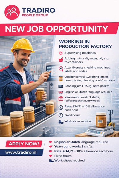 Szukamy osób, które chcą ciężko pracować, są sprawne i dokładne, potrafią porozumiewać się w języku angielskim lub holenderskim i mogą pracować w systemie zmianowym.