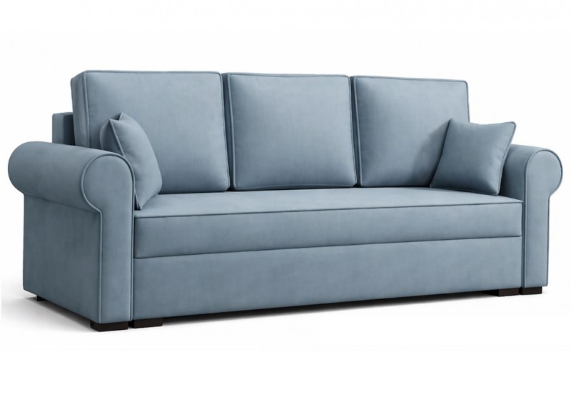 Nowoczesna sofa do salonu z funkcją spania i pojemnikiem na pościel. Wykończona mięciutką w dotyku tkaniną plamoodporną i wodoodporną. Doskonale sprawdzi się zarówno w salonie, jak i pokoju młodzieżowym. To wygodny i ponadczasowy mebel, który w nocy zamieni się w wygodne łóżko. Solidna, stabilna i modna urzeka od pierwszego wejrzenia.