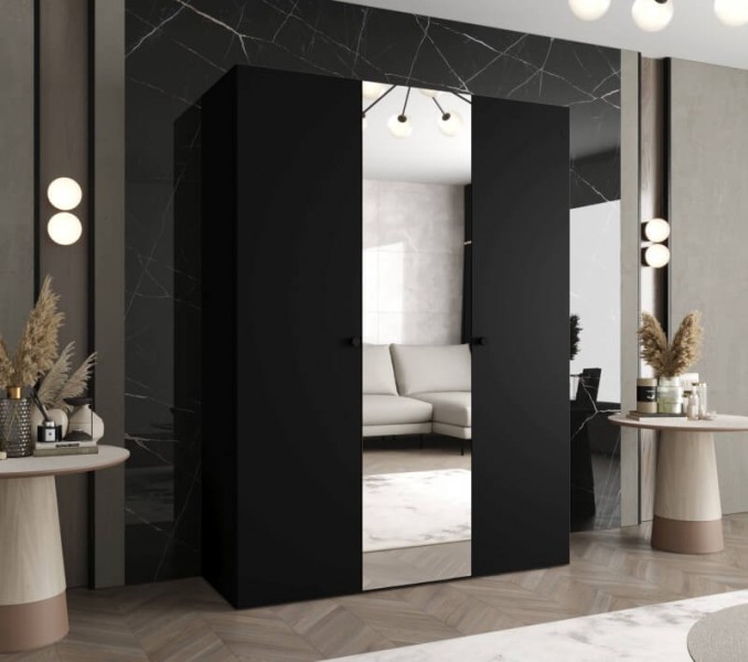 Mała szafa uchylna 150 cm z lustrem. Pojemna szafa do salonu, pokoju młodzieżowego lub przedpokoju. Szafa dostępna w 5 kolorach. W standardzie wnętrze szafy stanową 2 półki oraz 2 drążki na ubrania wiszące. Dzięki tak zaprojektowanemu wnętrzu będzie idealną szafą do przedpokoju.